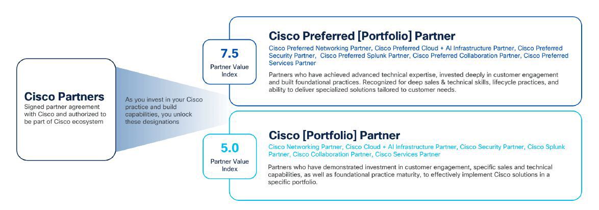 De kern van het programma is de Partner Value Index (PVI). Deze index laat per Cisco-domein zien hoeveel waarde een partner in de praktijk levert. Daarbij wordt gekeken naar ondersteuning over de hele IT-lifecycle, aantoonbare kennis en certificeringen, het meegroeien met klanten en het gebruik en vernieuwen van oplossingen. De PVI-score loopt van 0 tot 10. Vanaf 5,0 ben je Cisco Partner. Bij 7,5 of hoger krijg je de status Cisco Preferred Partner. Partners met deze scores dragen aantoonbaar bij aan klantresultaten en innovatie binnen netwerk, cloud en security.